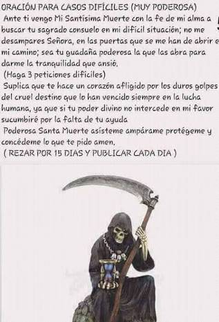 Mi linda santa tráemelo a agvsantisima muerte con la fe de mi alma a buscar tu sagrado consuelo en mi dificil situacion , no me desampares señora, en las puertas, que se me han de adrir enmi camino , sea tu guadaña poderosa la que las abra para dame la tranquilidad que ansio { haga 3 peticiones dificiles} suplica que te hace uncorazon afligido por los dura golpes del cruel destino que lo han vencido siempre en la lucha humana ya que si tu poder divino no intercede en mi favor sucumdire por la falta de tu ayuda Poderosa santa muerte asisteme amparame protegeme y concedeme lo que te pido amen {rezar por 15 dias ypublicar cada dia}